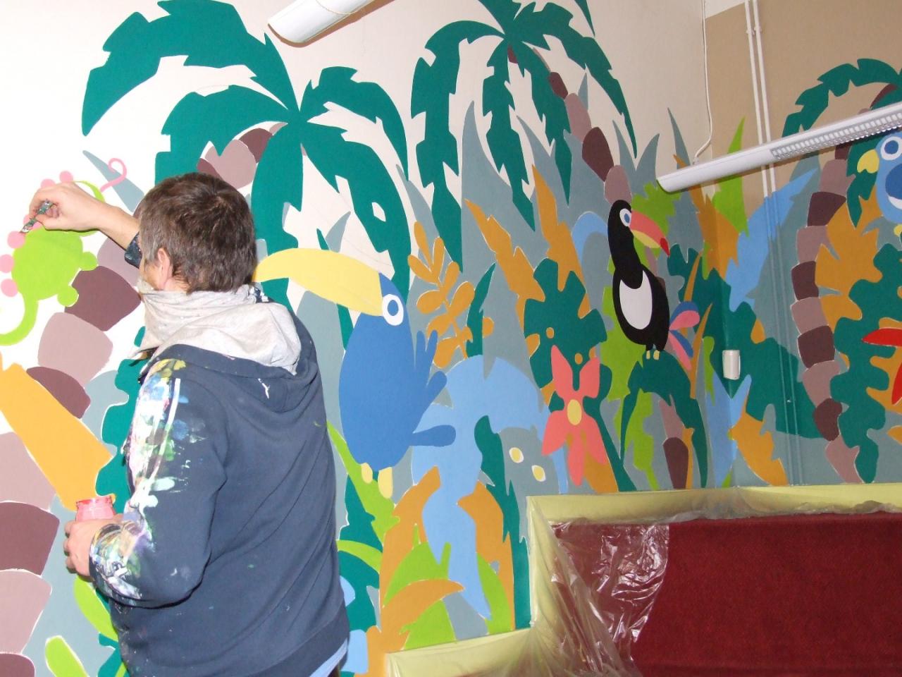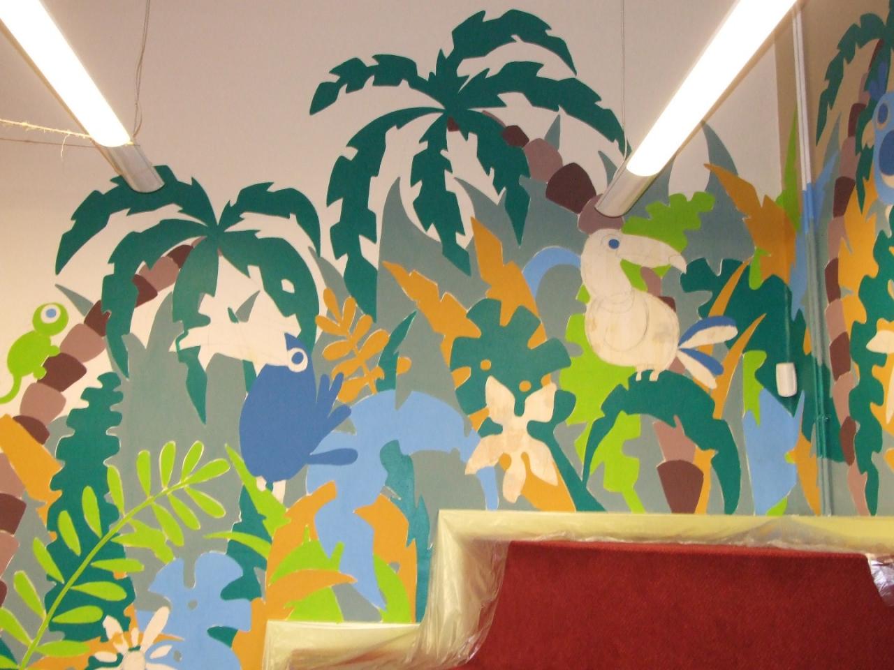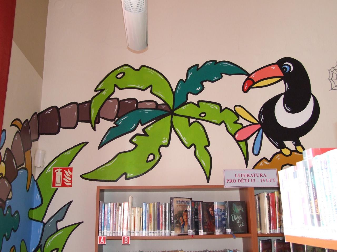 Oslovili jsme dekorativního malíře Jana Svitáka a ten se tohoto úkolu ujal. Během prvního únorového týdne roku 2021 vznikla džungle nejen nad stupínkem, ale i v oddělení pro starší děti. A povedla se. Posuďte sami.